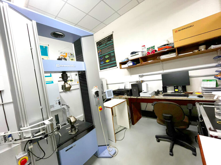 > Máquina de ensaios mecânicos Shimadzu, Modelo AGX-100N com estufa térmica e câmera CCD para medidas de deslocamento, software de modelagem por elementos finitos ABACUS;